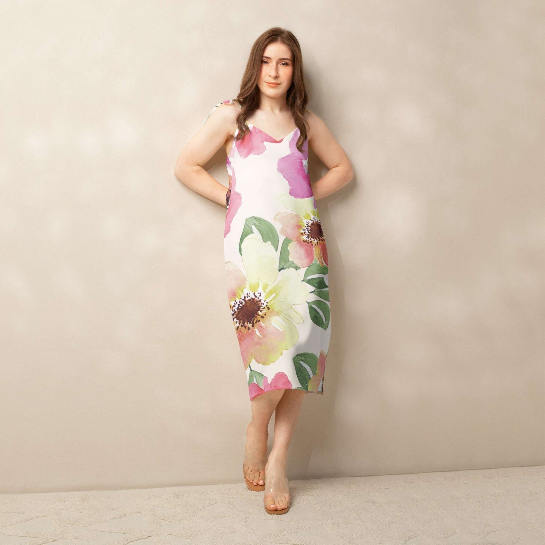 Floaty, flirty, and totally flattering—from daytime garden parties to dinner dates. This midi dress features a breezy side slit, adjustable tie straps, and a built-in bra for no-fuss style.